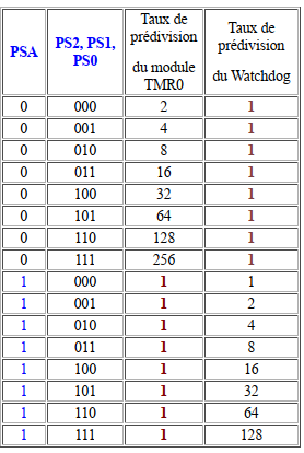 | Bit 3 | PSA | « Prescaler assignment » Le prédiviseur est attribué : • au module TMR0 quand PSA = 0 • au Watchdog quand PSA = 1 |